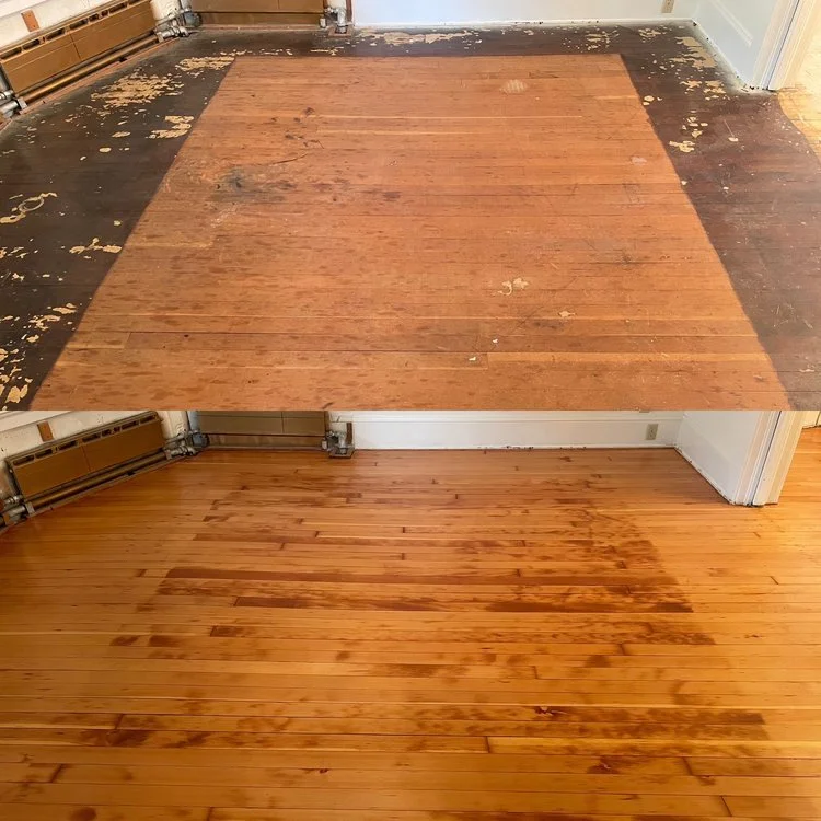 Side-by-side comparison of a hardwood floor before and after refinishing, showing a cleaned and polished surface.